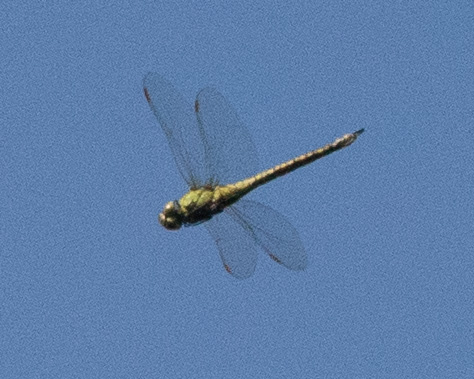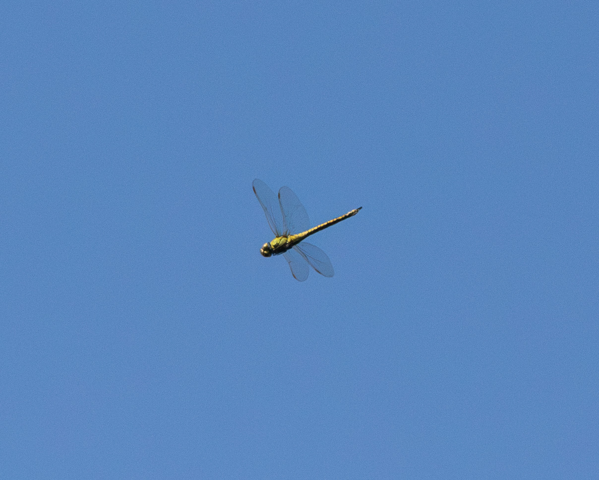 Imago. Female. Svenskeholmvej øst. UPDATE: CORRECTED TO A POSITIVE Blue-eyed Hawker because the thorax pattern fits it very well, and the general appearance and the fact that there have been several observations around. It would after all be much more of a sensation to find a viridis here on the island. So. But I leave the original text, to understand the context. ORIGINAL: Blue-eyed Hawker (A. affinis)[Sydlig Mosaikguldsmed] - Green Hawker (A. viridis) [Grøn Mosaikguldsmed] ? Flying in the open above the road on the border between the forest and open short-grassed fields. No water nearby. I didn't have time to nail it properly, hoping the photos would do the trick, but they are not good enough for me to id it positively. A female of course with two long appendages and the very visible ovipositor. There are a few markings on the side of the otherwise all green thorax and the proximal segments of the abdomen are very uniformly green, the others becoming more checkered toward the tip. This pattern is good for both Southern Hawker and Green Hawker. Southern would be early in Denmark even for this year and Green would be unexpected since it has never been seen on Amager. However, Hot weather today with southern winds could undoubtedly have provoked movements from the south, why I would like it best for an affinis; this also because the main flight period in NC Europe is very much ongoing. And Green being a NE European, and more selective, species it is probably less likely to wander like Southern does. [Lars Johansen mentions that he has experienced Green as a wanderer, especially females]. Both Blue Emperor [Stor Kejserguldsmed] and Blue Hawker [Blå Mosaikguldsmed] are excluded based on size, shapes or patterns - it didn't look big in flight. |